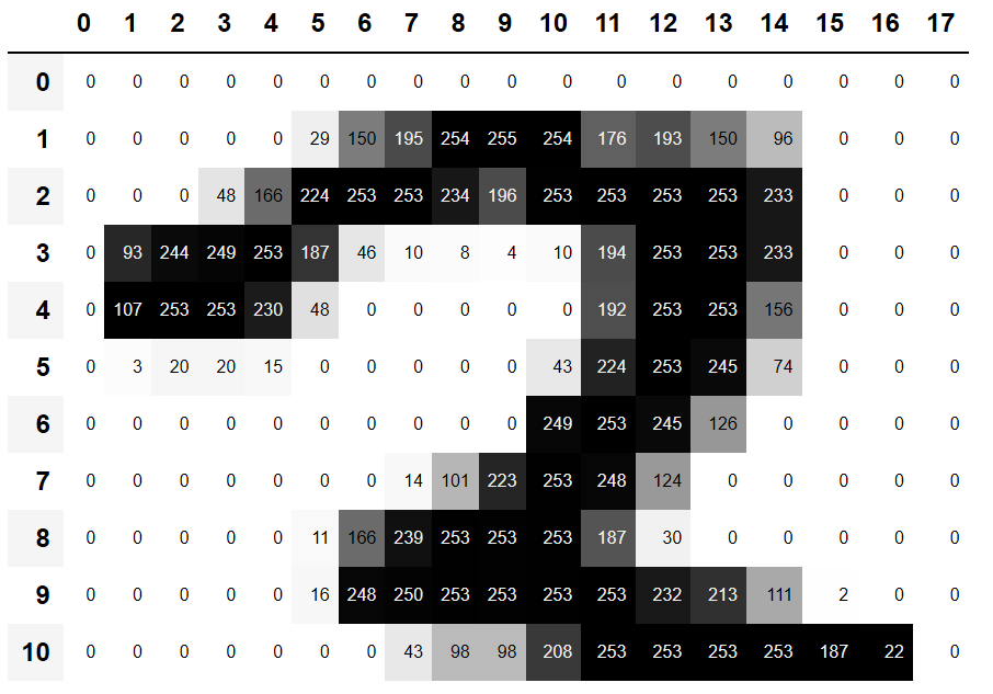 We can slice the array to pick just the part with the top of the digit in it, and then use a Pandas DataFrame to color-code the values using a gradient, which shows us clearly how the image is created from the pixel values:
