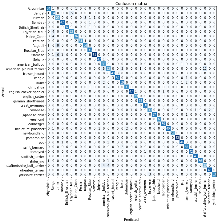 Since we are not pet breed experts, it is hard for us to know whether these category errors reflect actual difficulties in recognizing breeds. So again, we turn to Google. A little bit of Googling tells us that the most common category errors shown here are actually breed differences that even expert breeders sometimes disagree about. So this gives us some comfort that we are on the right track.