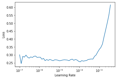 Note that the graph is a little different from when we had random weights: we don’t have that sharp descent that indicates the model is training. That’s because our model has been trained already. Here we have a somewhat flat area before a sharp increase, and we should take a point well before that sharp increase—for instance, 1e-5. The point with the maximum gradient isn’t what we look for here and should be ignored.