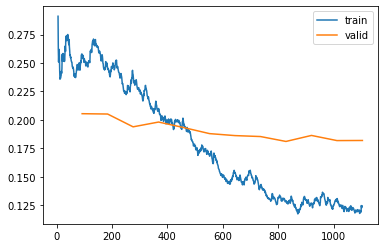 fastai lets you pass a Python slice object anywhere that a learning rate is expected. The first value passed will be the learning rate in the earliest layer of the neural network, and the second value will be the learning rate in the final layer. The layers in between will have learning rates that are multiplicatively equidistant throughout that range. Let’s use this approach to replicate the previous training, but this time we’ll only set the lowest layer of our net to a learning rate of 1e-6; the other layers will scale up to 1e-4. Let’s train for a while and see what happens: