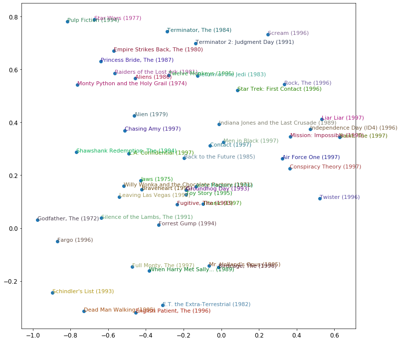 We can see here that the model seems to have discovered a concept of classic versus pop culture movies, or perhaps it is critically acclaimed that is represented here.