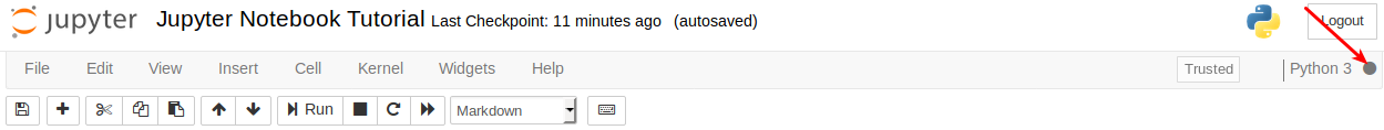 To know if your kernel (the Python engine executing your instructions behind the scenes) is computing or not, you can check the dot in your upper right corner. If the dot is full, it means that the kernel is working. If not, it is idle. You can place the mouse on it and the state of the kernel will be displayed.